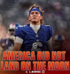 TRENDY: Nováček v newyorské #Giants rozehrávač Jaxson Dart nevěří, že Amerika přistála na Měsíci s misí Apollo 11 v roce 1969.