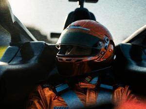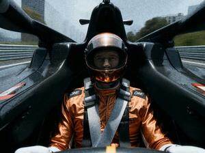 Ripresa cinematografica dal cockpit di un pilota di Formula 1 con un casco e una tuta arancioni luminosi, le cinghie di sicurezza che lo tengono saldamente in posizione. La telecamera cattura i suoi movimenti rapidi e improvvisi mentre inizia a guardarsi intorno, la testa che si muove da un lato all'altro con urgenza acuta. Allo stesso tempo, l'auto inizia a spostarsi e inclinarsi in una curva, lo sfondo che sfuma con il movimento della pista. Le vibrazioni e il leggero tremolio della telecamera amplificano la tensione, immergendo lo spettatore nella reazione in un attimo sia del pilota che della macchina mentre si tuffano nella curva ad alta velocità.