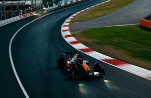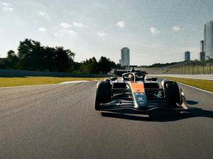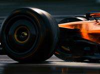 Ripresa dinamica a bassa angolazione di una macchina di Formula 1 che sfreccia lungo il rettilineo a tutta velocità, il suo corpo aerodinamico che fende l'aria mentre le onde di calore si sollevano dall'asfalto. La livrea nera e arancione lucida brilla sotto il sole pomeridiano, mentre i bordi sfocati della pista e le recinzioni enfatizzano l'intensità del movimento. Il pilota, completamente concentrato dietro il visore, mantiene la stabilità mentre la macchina ruggisce in avanti, i grattacieli che si stagliano debolmente in lontananza. La telecamera rimane bloccata frontalmente, creando un potente senso di velocità pura e ingegneria di precisione che domina la pista.