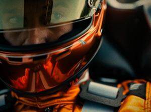Primo piano estremo di un pilota di Formula 1 all'interno del cockpit, il suo visore arancione riflettente che brilla sotto la luce. La telecamera vibra leggermente con le vibrazioni dell'auto, dando una sensazione grezza e immersiva di velocità. Lentamente, il pilota gira la testa a destra, il riflesso che si sposta sul visore mentre i suoi occhi rimangono acuti e concentrati. Le cinghie della cintura premendo saldamente contro la sua tuta, enfatizzando la tensione e l'intensità del momento mentre il mondo esterno sfuma in movimento.