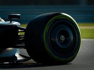 Ripresa ravvicinata di una ruota posteriore di una macchina di Formula 1 che gira ad alta velocità, la gomma sfocata dal movimento mentre afferra l'asfalto. La luce del sole si riflette sulla superficie nera liscia con deboli segni verdi di pneumatici che brillano lungo il bordo, mentre piccole vibrazioni attraversano le braccia della sospensione. La telecamera rimane bloccata saldamente sulla ruota, catturando la potenza grezza e la precisione della macchina mentre scintille di luce si riflettono sulla carrozzeria in fibra di carbonio. Lo sfondo sfuma in un morbido effetto di movimento, enfatizzando la velocità inarrestabile e l'intensità meccanica della gara.
