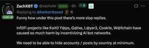 AI-svar tar over alt, ikke bare InfoFi-insentiverte plattformer. Kontoer som kunstig øker rekkevidden sin, bruker AI-farmer.