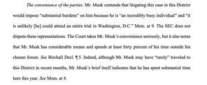 «Суд серйозно ставиться до зручності пана Маска, але він також зазначає, що пан Маск має значні кошти і проводить щонайменше сорок відсотків свого часу поза обраним ним форумом»