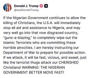 特朗普真的在拥抱加密创始人的角色……在一个discord中看到这个,回应他的真相社交帖子: 🇳🇬🇳🇬 今天对尼日利亚来说比9月11日更糟 ✈️✈️✈️ 😡😡😡 我们不原谅,我们不忘记 🇳🇬🇳🇬 🚫🚫🚫 唐纳德·特朗普会后悔惹恼尼日利亚 🚫🚫🚫