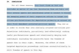 突發消息:今天,麻薩諸塞州的一個聯邦地區法院發出裁決,譴責特朗普政府試圖因為合法在場的非公民表達支持巴勒斯坦的言論而驅逐他們。法院解釋道:“我們不是,也不應該成為一個因為害怕他們要告訴我們的事情而監禁和驅逐人們的國家。”